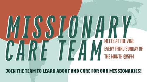 Come be part of the Missionary Care Team and get updates on the missions we support! Time is just before the Movie Night. Location is at The Vine Community's Youth Building.
